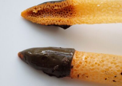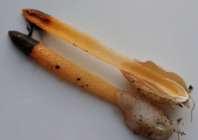Il fait 10 cm de haut, d’abord c’était un œuf puis se dresse et porte une tête couverte d’une gléba (partie gélatineuse qui sent l’odeur de cadavre) brun olive.
